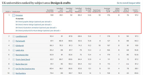但其實它的藝術(shù)設(shè)計專業(yè),不論硬件還是師資實力,都相當(dāng)過硬,不輸很多專門的藝術(shù)院校。2020年《衛(wèi)報》英國設(shè)計與工藝專業(yè)排名上,Kingston插畫,動畫,平面設(shè)計,室內(nèi)設(shè)計與產(chǎn)品設(shè)計課程均排名全英第1!