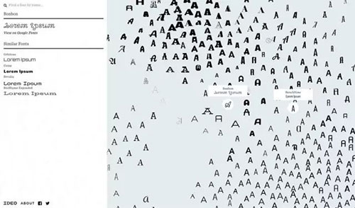 尋找特定的字體可能是一件非常麻煩的事情,而IDEO 干脆設(shè)計(jì)了一個(gè)字體地圖,你可以一目了然地在上面看到750種不同的字體,其中展示的字母可以根據(jù)你的輸入來(lái)進(jìn)行調(diào)整。如果你感覺(jué)某個(gè)字體符合你的想法,點(diǎn)擊它就能跳轉(zhuǎn)到這一字體在Google Fonts 中的頁(yè)面。