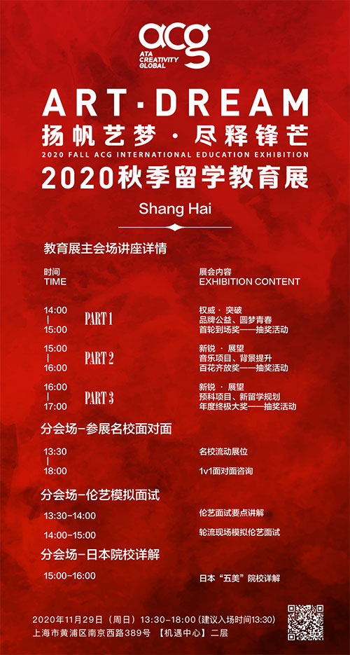 2020 ACG秋季留學(xué)教育展,我們不僅有名校面對(duì)面和驚喜福利環(huán)節(jié),還有倫藝模擬面試 和 日本“五美”院校 詳解。對(duì)倫藝、日本“五美”感興趣的同學(xué),千萬(wàn)不要錯(cuò)過(guò)哦!
