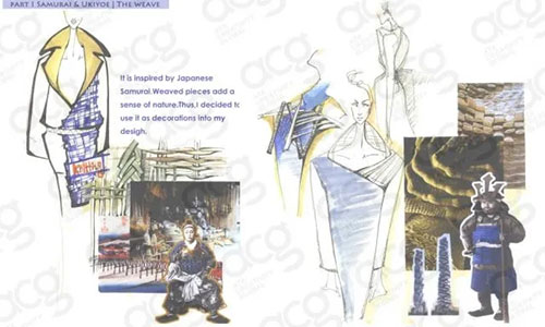 學(xué)姐直接用的設(shè)計草圖展示的自己的靈感過程:她從海浪的顏色,層層疊疊形狀與日本武士傳統(tǒng)的寬袖等等地方找到了她的設(shè)計靈感。