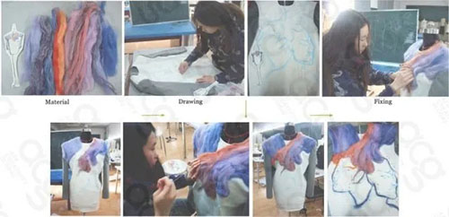 從日本武士的傳統(tǒng)服裝以及日本浮世繪中的一些元素中找到以上靈感之后,學(xué)姐下一步就呈現(xiàn)了自己的繪畫過程和服裝的制作過程。