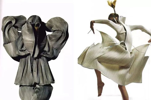 西方服飾設(shè)計(jì)注重線條,三宅一生則另辟蹊徑,從東方服飾文化與哲學(xué)觀照中探求全新的服裝功能、裝飾與形式之美,這在當(dāng)時(shí)是非常具有創(chuàng)造性的設(shè)計(jì)理念。