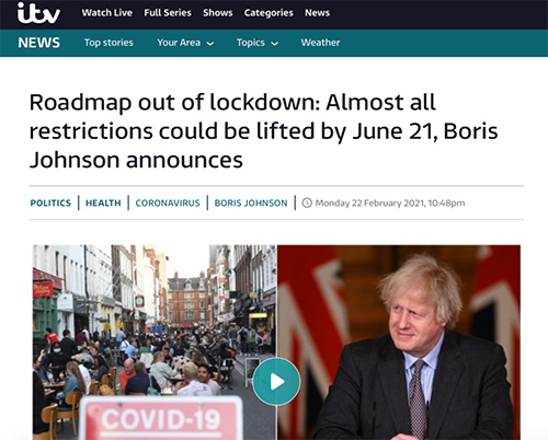 據(jù)外媒ITV News 報道,鮑里斯·約翰遜(Boris Johnson)在接受采訪時宣布了英國最新的解封計劃,他說到英格蘭已經(jīng)處于“通往自由的單向道路”上,英國將在6月21日迎來所有禁令到解除,獲得全面解封。